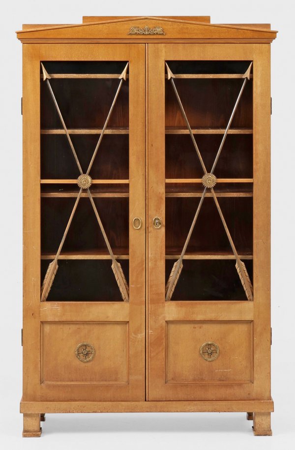 Biedermeier-Vitrinenschrank Helles Mahagoni, furniert. Gerader, hochrechteckiger Korpus auf gekanteten Füßen. In der gegliederten Front zwei Vitrinentüren mit Sprossen aus gekreuzten Pfeilmotiven. Gestuft ansteigender oberer Abschluss. Herstellerplakette. H. 164 cm. 102 cm x 32,5 cm.