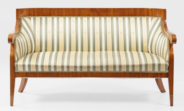 Biedermeier-Sofa Nussbaum, furniert. Gerade Zarge auf konischen Vierkantbeinen, in gebogte Stütze für geschweift ansteigende Armlehnen übergehend. Gewölbte Rückenlehnenrahmung. Allseitig gepolstert und bezogen. H. 85 cm. 153 cm x 60 cm. Sitz-H. 44 cm.