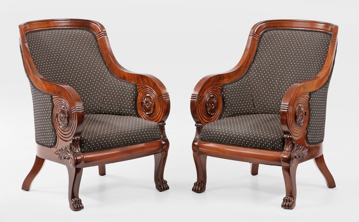 Paar große Biedermeier-Bergèren Mahagoni, massiv und furniert. Bombierte Zarge auf leicht geschweiften Beinen mit Tatzenfüßen. Geschweift ansteigende Armlehnen aus üppigen, eingerollten Volutenmotiven und Blattrosetten, in gewölbte Rückenlehnenrahmung übergehend. Allseitig gepolstert und bezogen. H. 97 cm. 66 cm x 82 cm. Sitz-H. 39 cm.