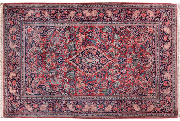 Alte Keschan-Brücke Persien. Um 1940. Korkwolle auf Baumwolle. Im hellroten Innenfeld gestrecktes Zentralmedaillon sowie passig geschweifte Ecklösungen mit Bothéblüten in Dunkelblau. Flächendeckende Musterung aus Architekturmotiven und großzügig angelegte Blütenranken. Umlaufend breite, dunkelblaue Hauptbordüre aus Arabesken, Bothés und Blüten. 210 cm x 136 cm.