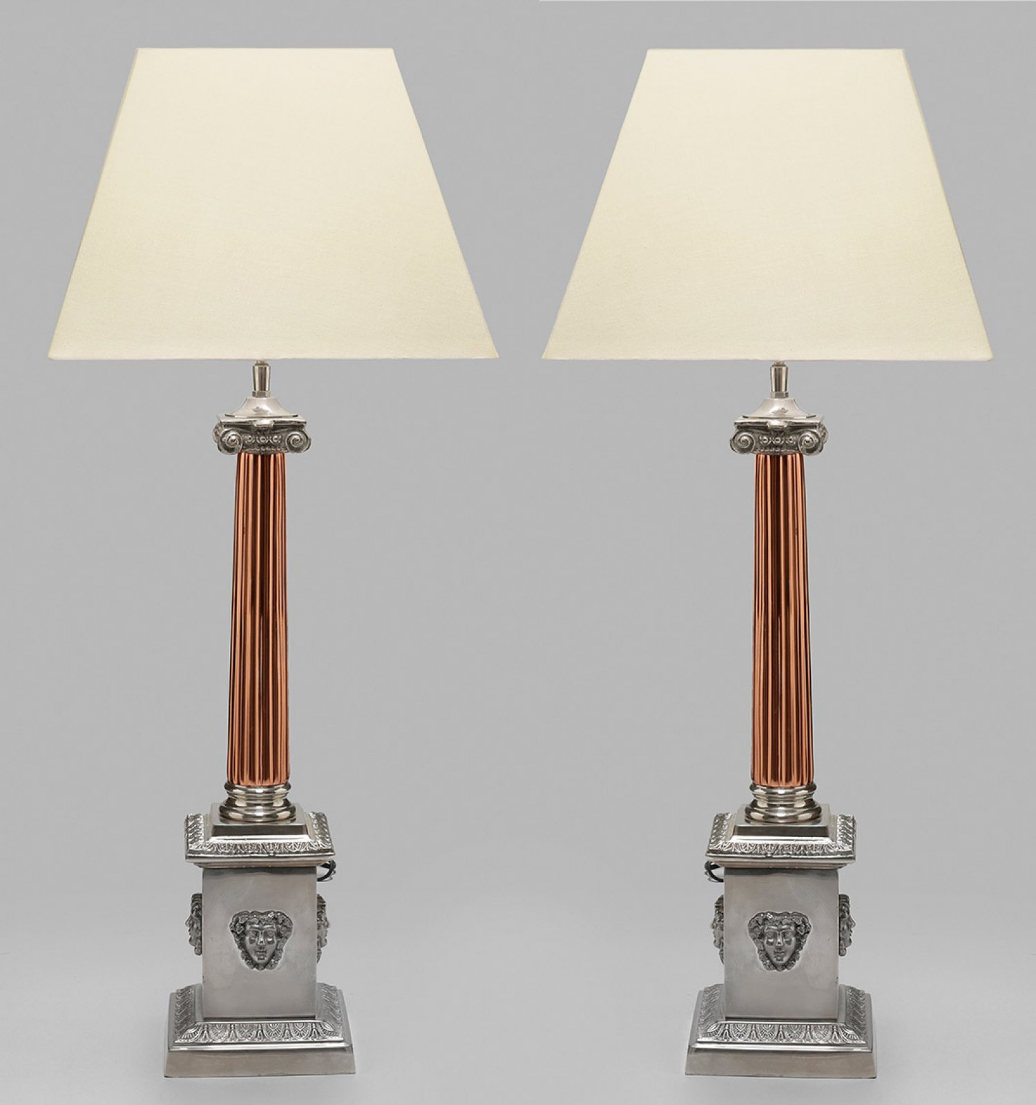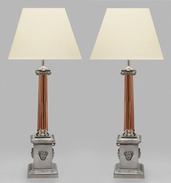 Paar große Tischlampen im Empire-Stil 1-flg.; Metall vernickelt bzw. verkupfert. Über rechteckigem Podestsockel mit breitem Blattfries und erhaben reliefierten Maskarons sich konisch verjüngender, kannelierter Säulenschaft mit ionischem Kapitell als Träger für Leuchtmittel. Konischer Lampenschirm. Elektrifiziert. H. 85 cm.
