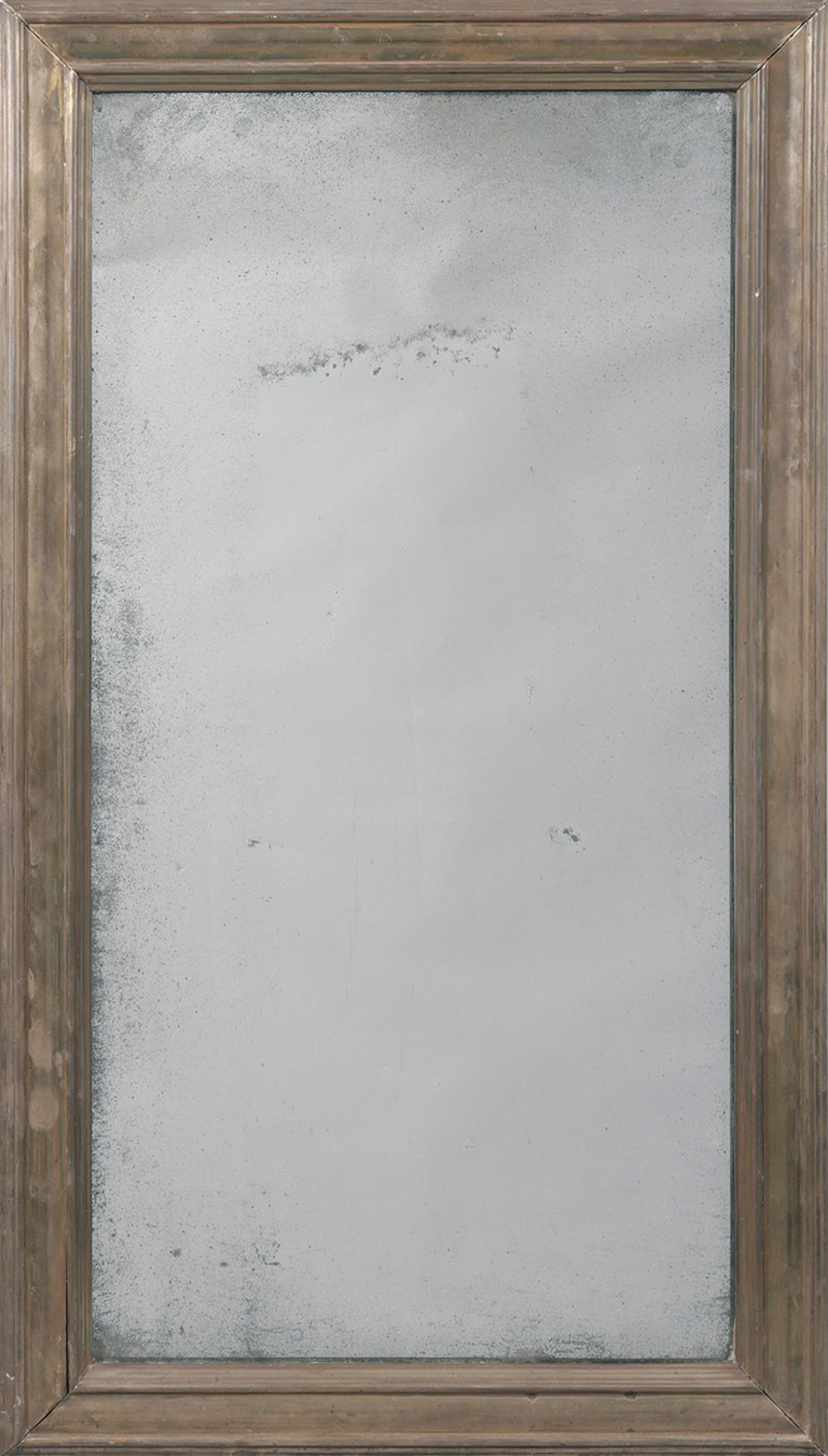 Russischer Biedermeier-Wandspiegel Holzrahmen, flächendeckend belegt mit Messingblech. Gerade, rechteckige Spiegelrahmung aus breitem Profilband. Altes Spiegelglas. 131 cm x 76 cm.