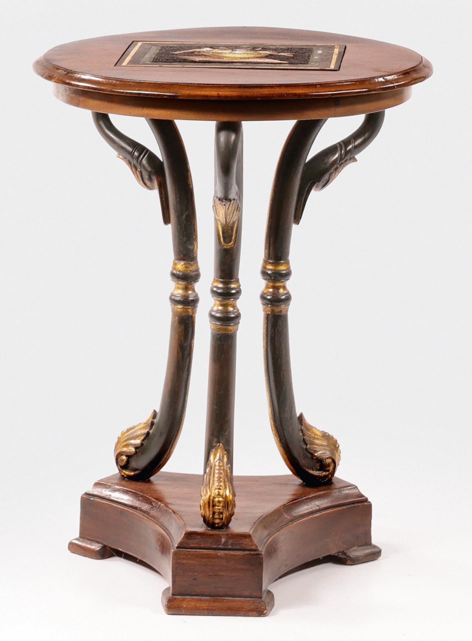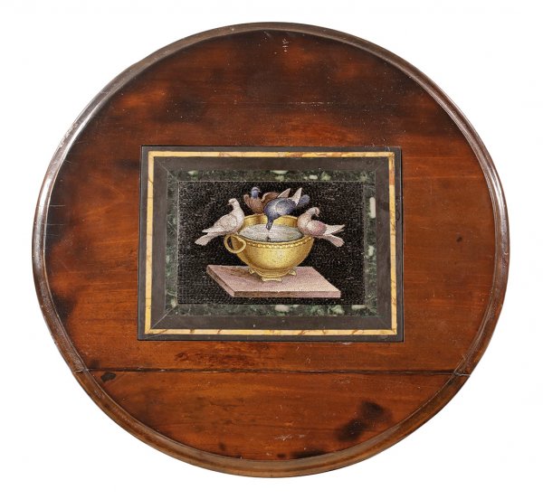 Empire-Beistelltisch mit seltenem Mikromosaik Mahagoni furniert bzw. geschnitzt, gefasst und teilw. vergoldet. Auf der runden, profilgerahmten Deckplatte rechteckiges Mikromosaik mit der Darstellung von vier Tauben an einer Wasserschale aus fein nuanciert eingelegten, unterschiedlich gefärbten Glasstäben in Gelb, Violett, Blau, Schwarz und Weiß. Umlaufende Rahmung aus unterschiedlichen Marmorsorten. Gestell aus drei gebogten Streben mit reliefplastischen Schwanenköpfen und Blattvoluten. Unterhalb dreiseitig eingezogene Sockelplatte. H. 70 cm. D. 55 cm.