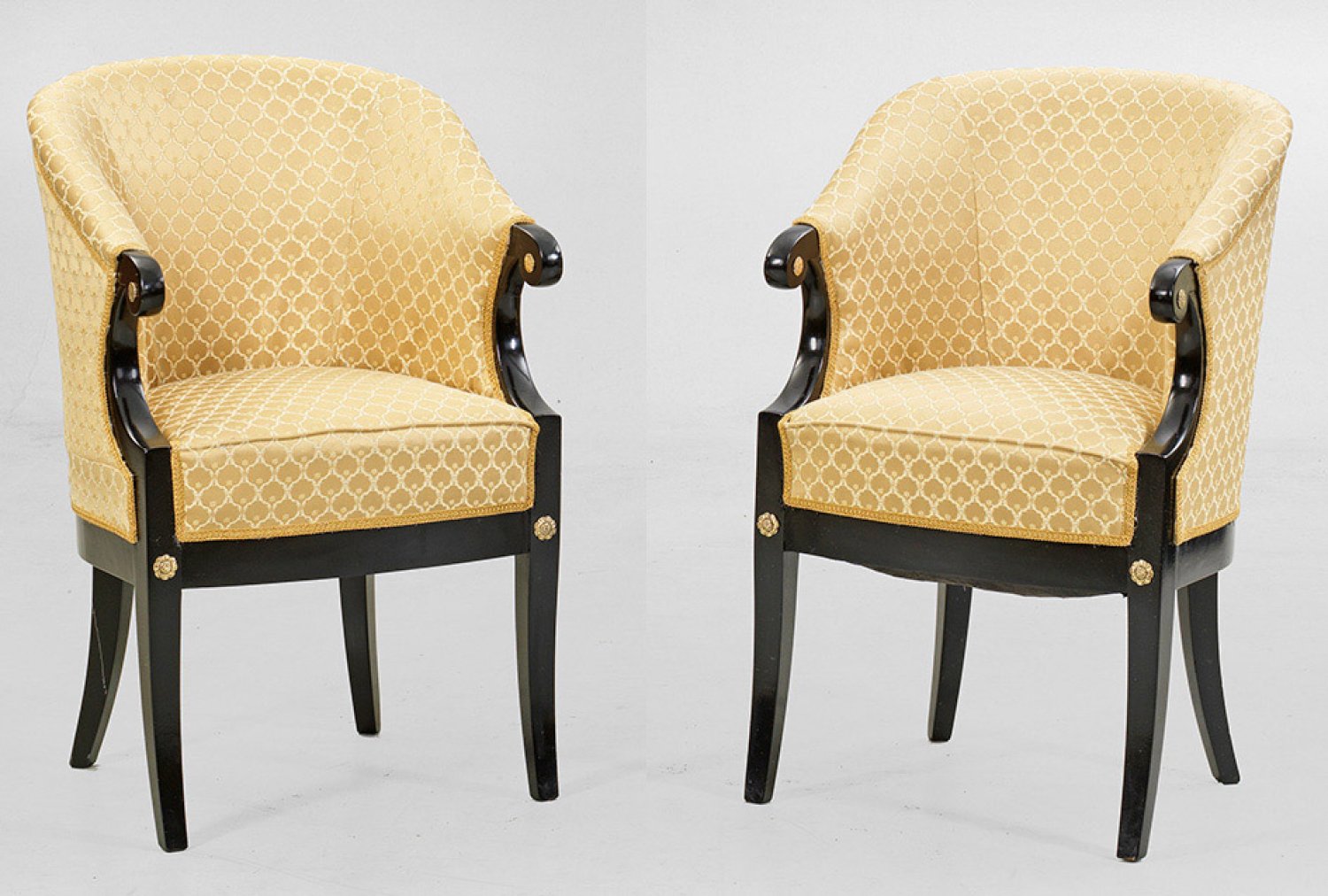 Paar Salonsessel im Empire-Stil Holz, schwarz lackiert. Hufeisenförmige Zarge auf leicht ausgestellten Vierkantbeinen. Konkav eingezogene Stützen für steil ansteigende, schmale Armlehnen, in gewölbte Rückenlehnenrahmung übergehend. Allseitig gepolstert und bezogen. H. 87 cm. 55 cm x 56 cm. Sitz-H. 50 cm.