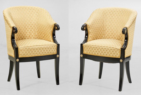 A pair of French black lacquered Empire style easy chairs.