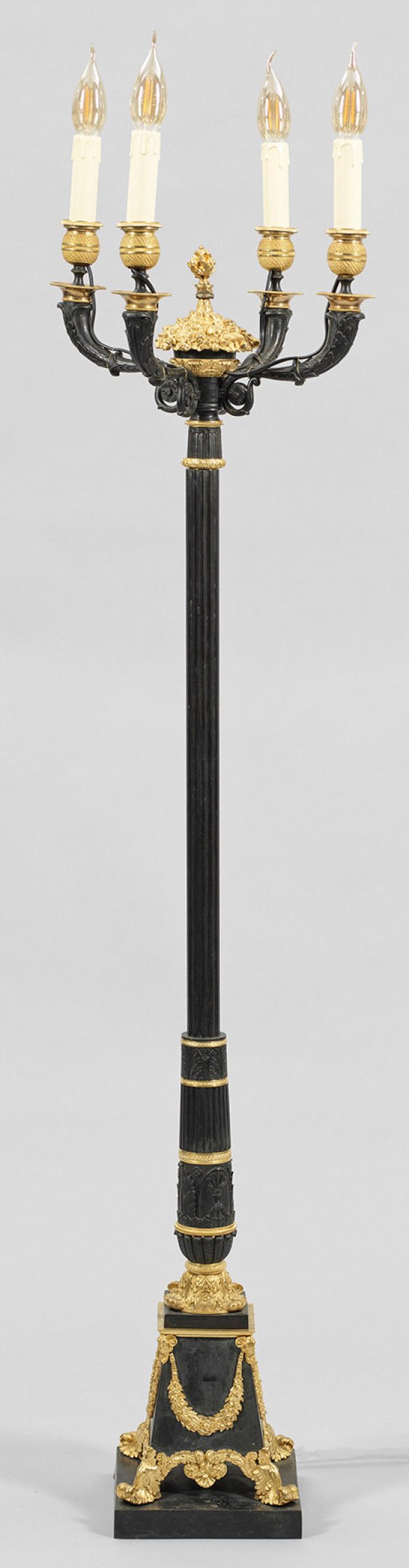 Salonlampe im Empire-Stil 4-flg.; Bronze, dunkel patiniert und teilw. vergoldet. Über konisch ansteigendem Sockel mit Volutenfüßen und erhaben reliefierten Festons mehrfach gegliederter, godronierter und blattreliefierter Schaft. Oberhalb davon ausgehend geschwungene Leuchterarme aus eingerollten Voluten mit balusterförmigen Tüllen. Elektrifiziert. Lampen-H. 138 cm.