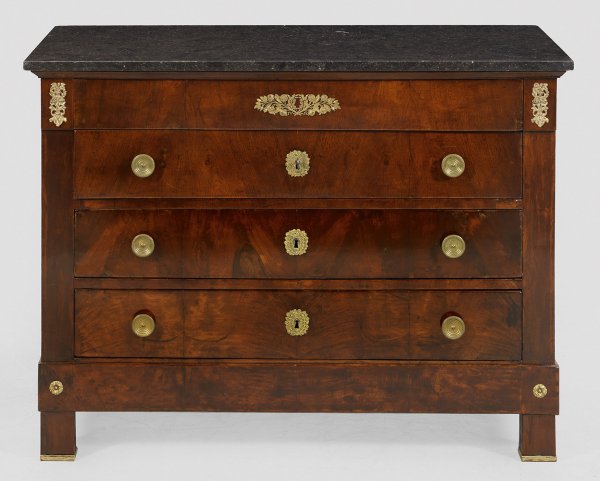 Große Empire-Kommode Mahagoni, furniert. Gerader, querrechteckig angelegter Korpus auf geradem Zargensockel und gekanteten Füßen. In der gegliederten Front vier breite Schubladen. Gering überstehende Deckplatte aus anthrazitfarbenem Marmor. H. 90 cm. 120 cm x 57 cm.