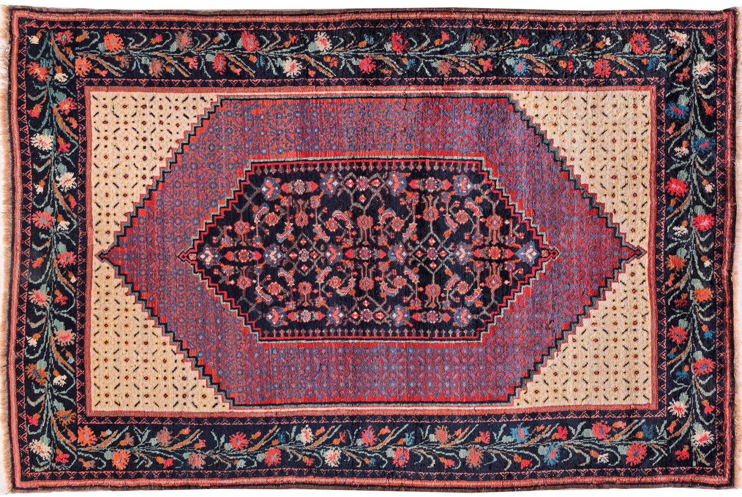 Karabagh-Teppich Aserbaidjan. Um 1940. Wolle auf Wolle. Auf beigefarbenem Fond gestaffelt angeordnete Rautenmotive mit Rapport- bzw. stilisiertem Rankenmuster. Umlaufend dunkelgrundige Bordüre aus gereihten Blüten. 220 cm x 150 cm.
