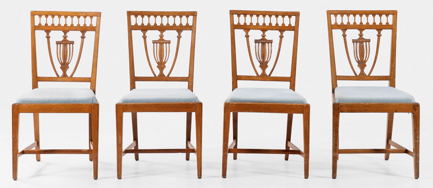 Satz von vier klassizistischen Stühlen Buchenholz. Trapezförmige Zarge auf konischen Vierkantbeinen, unterhalb durch schmale Stege verbunden. Rechteckige, durchbrochen gearbeitete Rückenlehnenrahmung mit vasenförmigem Mittelsteg sowie oberhalb Balustradenabschluss. Sitzfläche gepolstert und bezogen. Sitz-H. 47 cm.