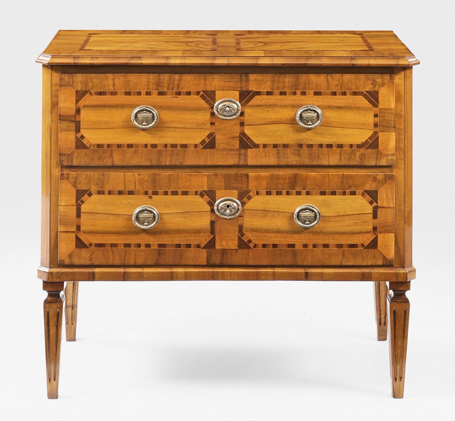 Louis XVI-Kommode Nussbaum, furniert sowie Einlagen aus Pflaumenholz. Gerader, querrechteckig angelegter Korpus, flankiert von schmalen, schräggestellten Ecklisenen auf kannelierten, gekanteten Balusterbeinen. In der gegliederten Front zwei große Schubladen. Gering überstehende, profilierte Deckplatte. Flächendeckend breit gerahmte Furnierfelder, von Bandeinlagen begrenzt. H. 86 cm. 96 cm x 52,5 cm.