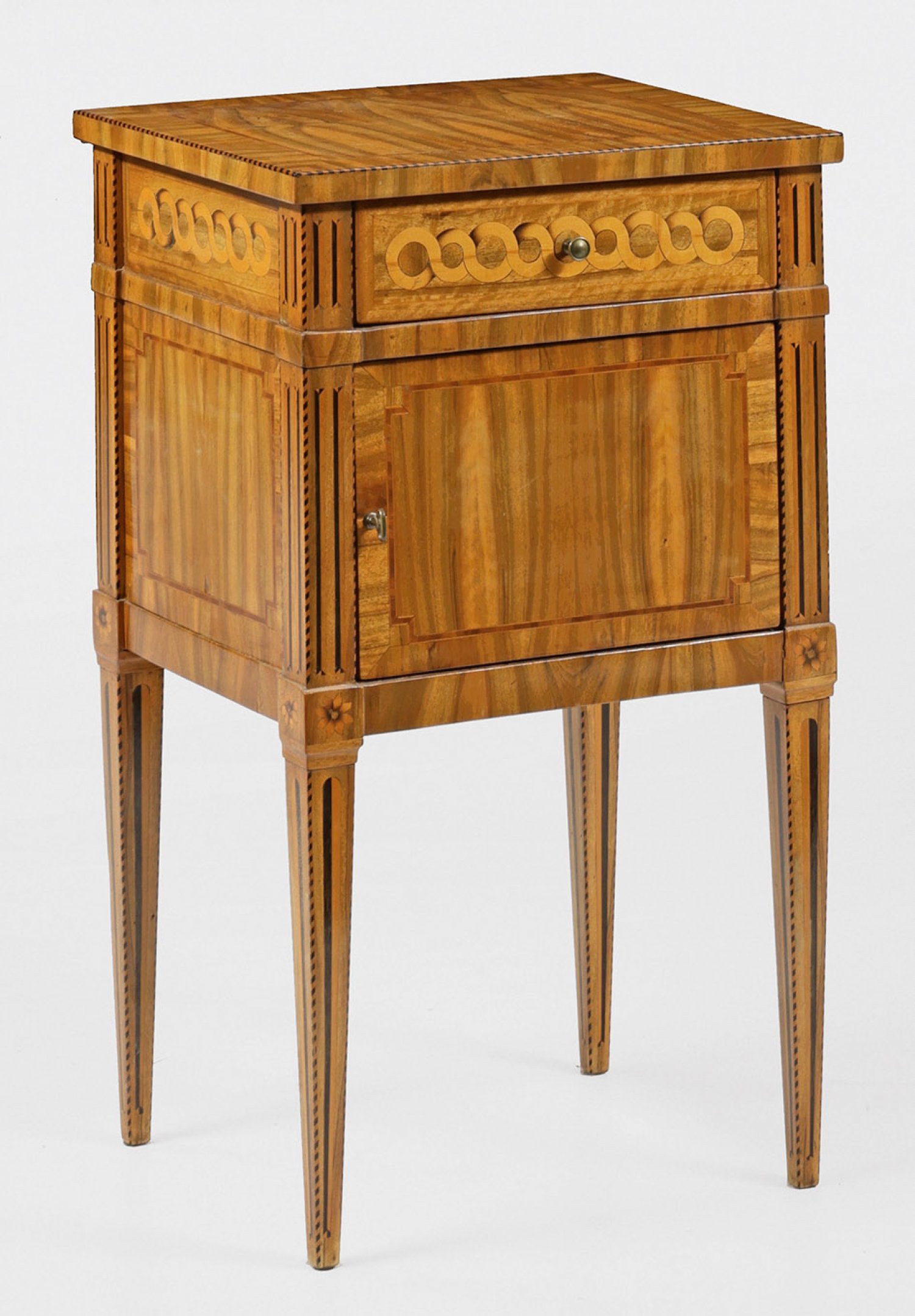 Louis XVI-Pfeilerschrank Nussbaum, furniert. Gerader, hochrechteckiger Korpus, allseitig flankiert von schmalen Pilastern mit Scheinkanneluren auf konischen Vierkantbeinen. In der gegliederten Front eine Tür sowie oberhalb Schubfach mit Wellenbandfries. Gering überstehende, rechteckige Deckplatte. Allseitig von Bandeinlagen begrenzte Furnierfelder. H. 80,5 cm. 47 cm x 40 cm.