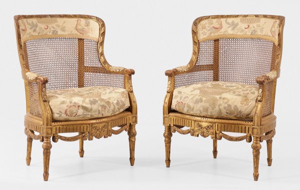 Paar große Louis XVI-Bergèren Holz, geschnitzt und goldfarben gefasst. Bombierte, kannelierte Zarge mit Festonmotiven auf schlanken Balusterbeinen. Geschweifte Stütze für schmale Armlehnen, in hohe, stark gewölbte Rückenlehnenrahmung übergehend. Sitz und Lehne aus teilw. besch. Rohrgeflecht. H. 100 cm. 73 cm x 60 cm. Sitz-H. 40 cm.