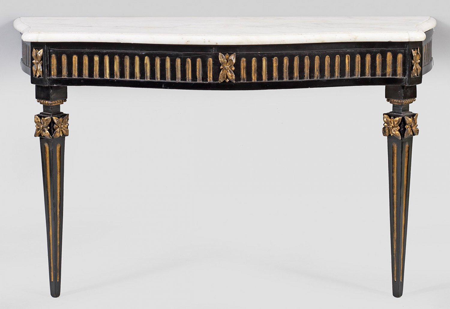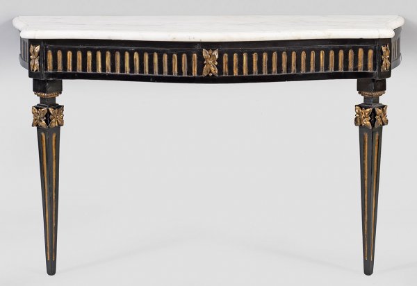 Große Louis XVI-Konsole Holz, schwarz lackiert und teilw. vergoldet. Bombierte, sich weitende, kannelierte Zarge mit verkröpften Ecken auf konischen Balusterbeinen mit reliefierten Blüten. Gering überstehende, profilierte Deckplatte aus weißem, hellgrau gemasertem Marmor. H. 77,5 cm. 128 cm x 51 cm.