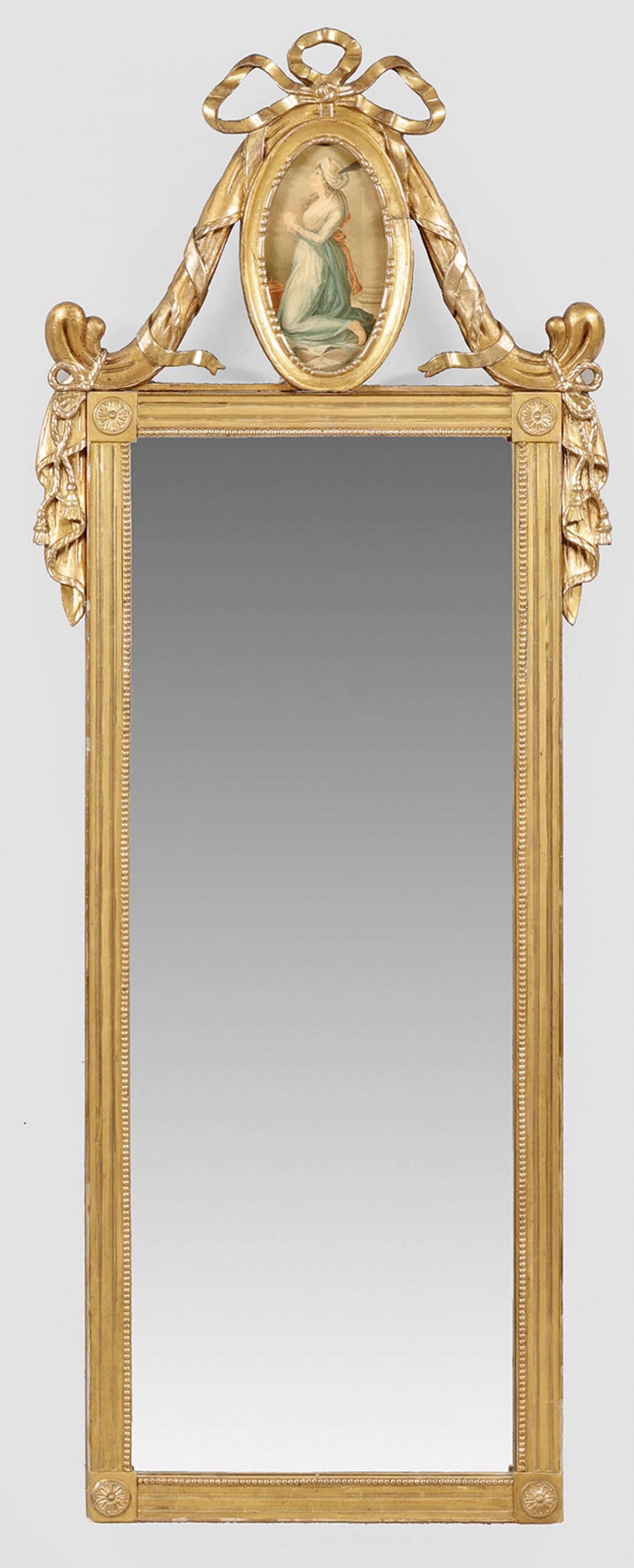 Louis XVI-Pfeilerspiegel Holz, stuckiert, gefasst und vergoldet. Schmale, hochrechteckige, kannelierte Spiegelrahmung mit reliefierten Rosetten auf den verkröpften Ecken. Oberhalb hochovales Medaillon mit polychromer Darstellung einer jungen Dame mit Turban sowie großer Schleifenbekrönung, Festons und Draperiewerk. 160 cm x 61 cm.