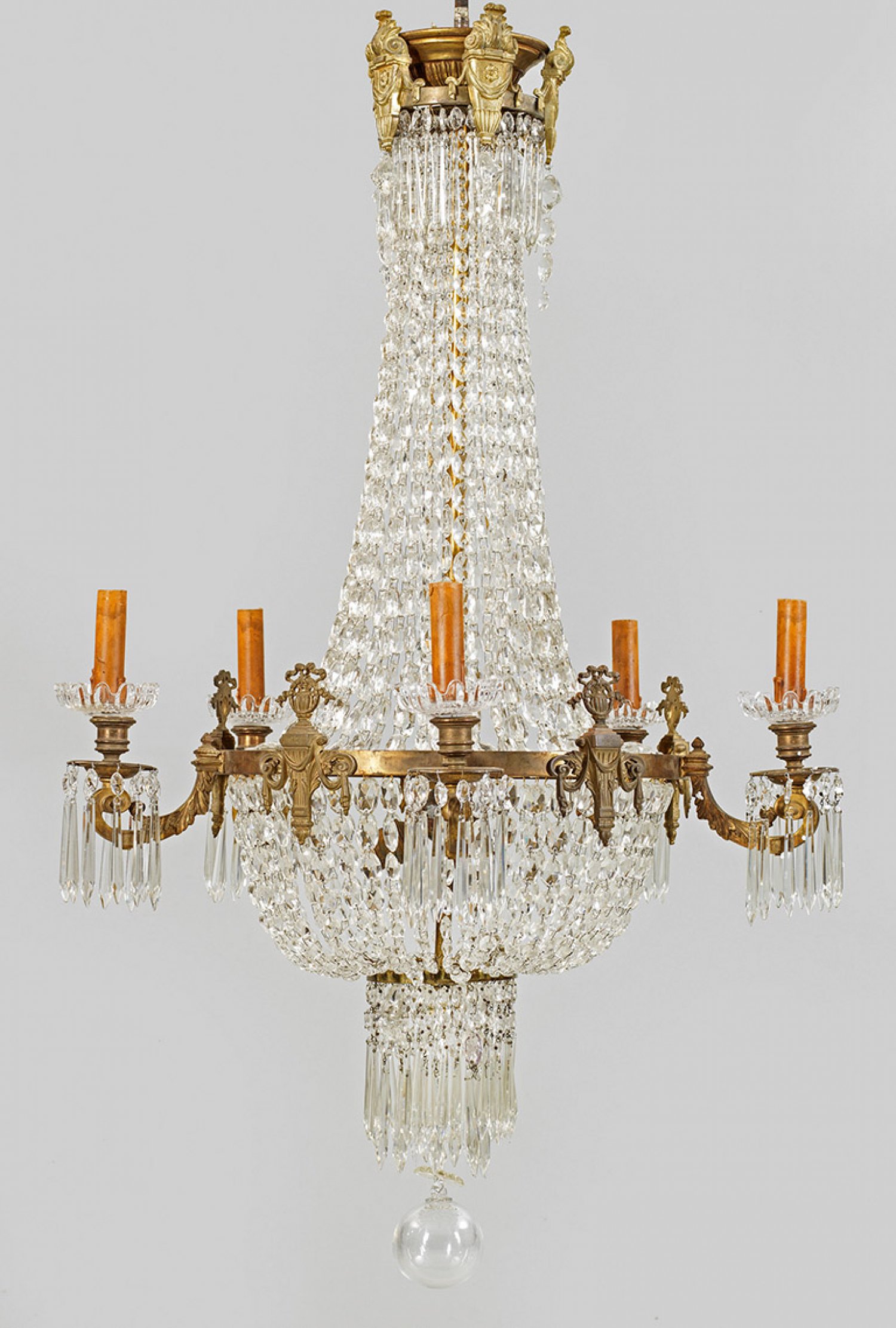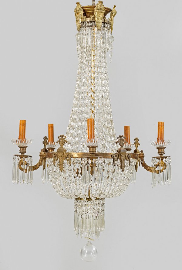 Napoleon III-Deckenlüster 5-flg.; Bronze, Messing und farbloses Glas. Balusterförmiger Korpus aus Prismenschnüren im Verlauf. In der Mitte schmaler Reif als Träger für blattreliefierte Leuchterarme aus eingerollten Voluten mit vasenförmigen Tüllen. Dazwischen vasenbekrönte Fächermotive. Behang aus facettierten Prismen. Innen drei Lampenfassungen. Elektrifiziert. H. 100 cm. D. 60 cm.