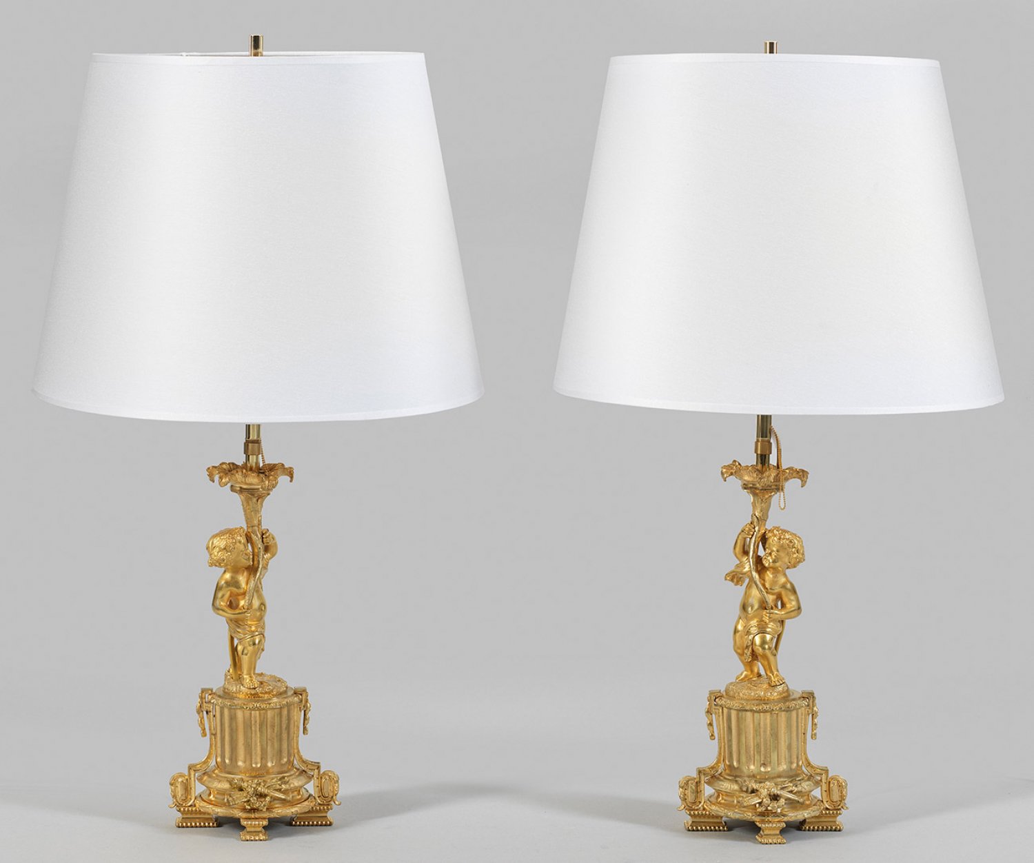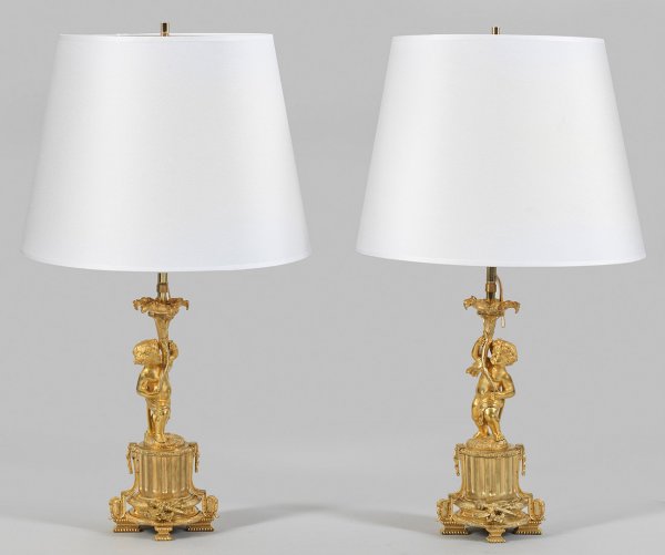 Paar Napoleon III-Tischlampen 2-flg.; Bronze, vergoldet. Über kanneliertem Profilsockel mit Volutenspangen vollplastische Darstellung eines Puttenknaben mit Füllhorn. Oberhalb neuzeitliche Montierung aus schlankem Schaft als Träger für Leuchtmittel. Konischer Lampenschirm. Elektrifiziert. H. 63 cm.