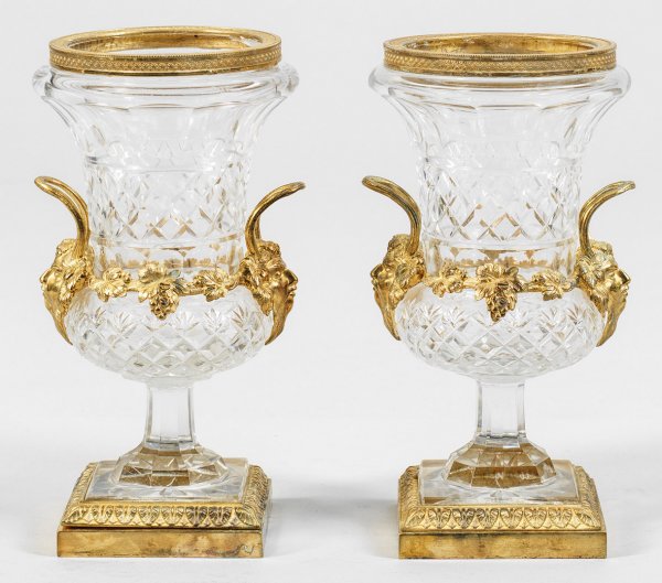 Paar feine Kristallvasen im Louis XVI-Stil Farbloses Kristallglas und fein ziselierte, vergoldete Bronze. Kraterförmiger Korpus mit weit ausschwingendem Lippenrand auf quadratischer Plinthe. Umlaufend der Wandung Dekor aus sog. Steinelschliff und Gitterwerk. Seitlich, über erhaben reliefierten Bacchanten-Maskarons, schmale, gebogte Henkel, durch Weinlaub verbunden. Unbez.; H. 21 cm.