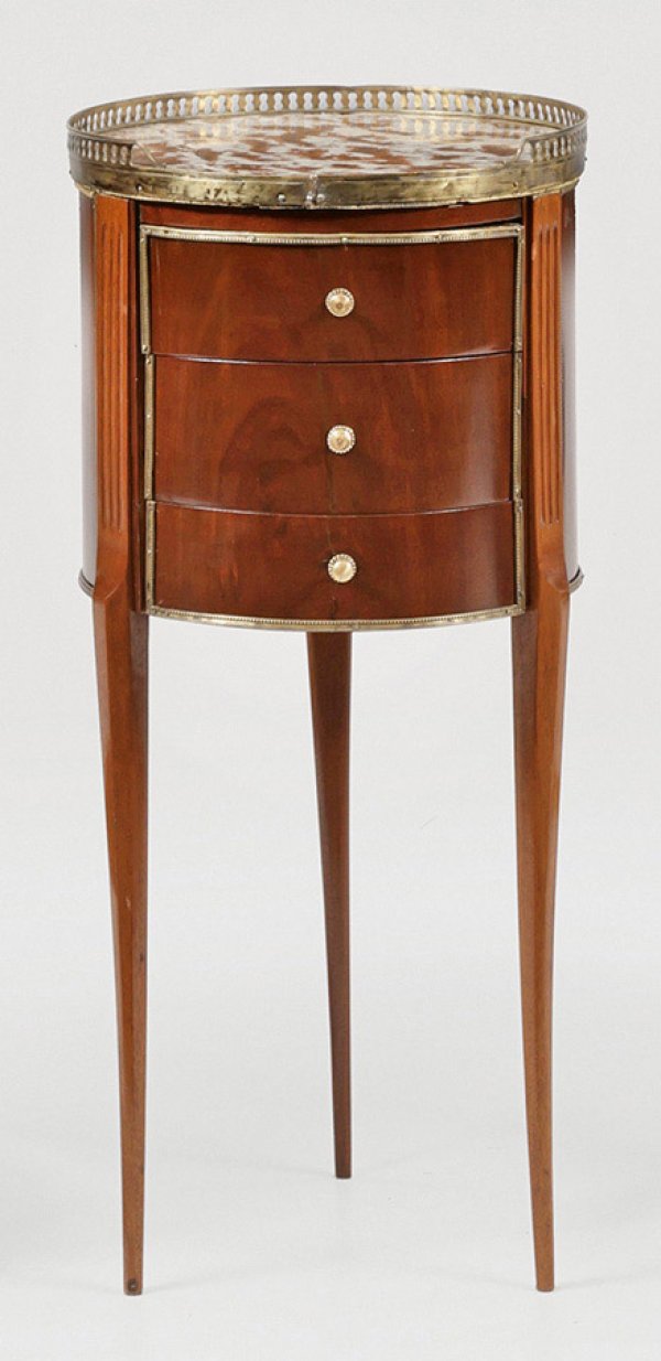 Louis XVI-Trommeltisch Mahagoni, massiv und furniert. Zylinderförmiger Korpus, flankiert von kannelierten Lisenen, in spitz zulaufende Beine übergehend. In der gegliederten Front drei Schubfächer mit umlaufendem Messingprofil. Profilgerahmte, runde Deckplatte aus hellgrau und rotbraun gemasertem Marmor mit durchbrochen gearbeiteter Galerierahmung. H. 81 cm. D. 37 cm.