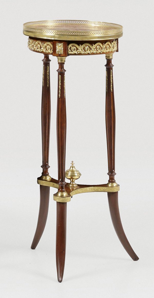 Louis XVI-Guéridon Mahagoni, massiv und furniert sowie Applikationen aus Messing. Bombierte Zarge mit umlaufendem Wellenbandfries auf schlanken, kannelierten und weit ausgestellten Balusterbeinen, unterhalb durch geschweiften Steg mit Balusterbekrönung verbunden. Gering überstehende, runde Deckplatte aus rotbraun, hellgrau und weiß gemasertem Marmor mit durchbrochen gearbeiteter Galerierahmung. H. 80,5 cm. D. 34 cm.