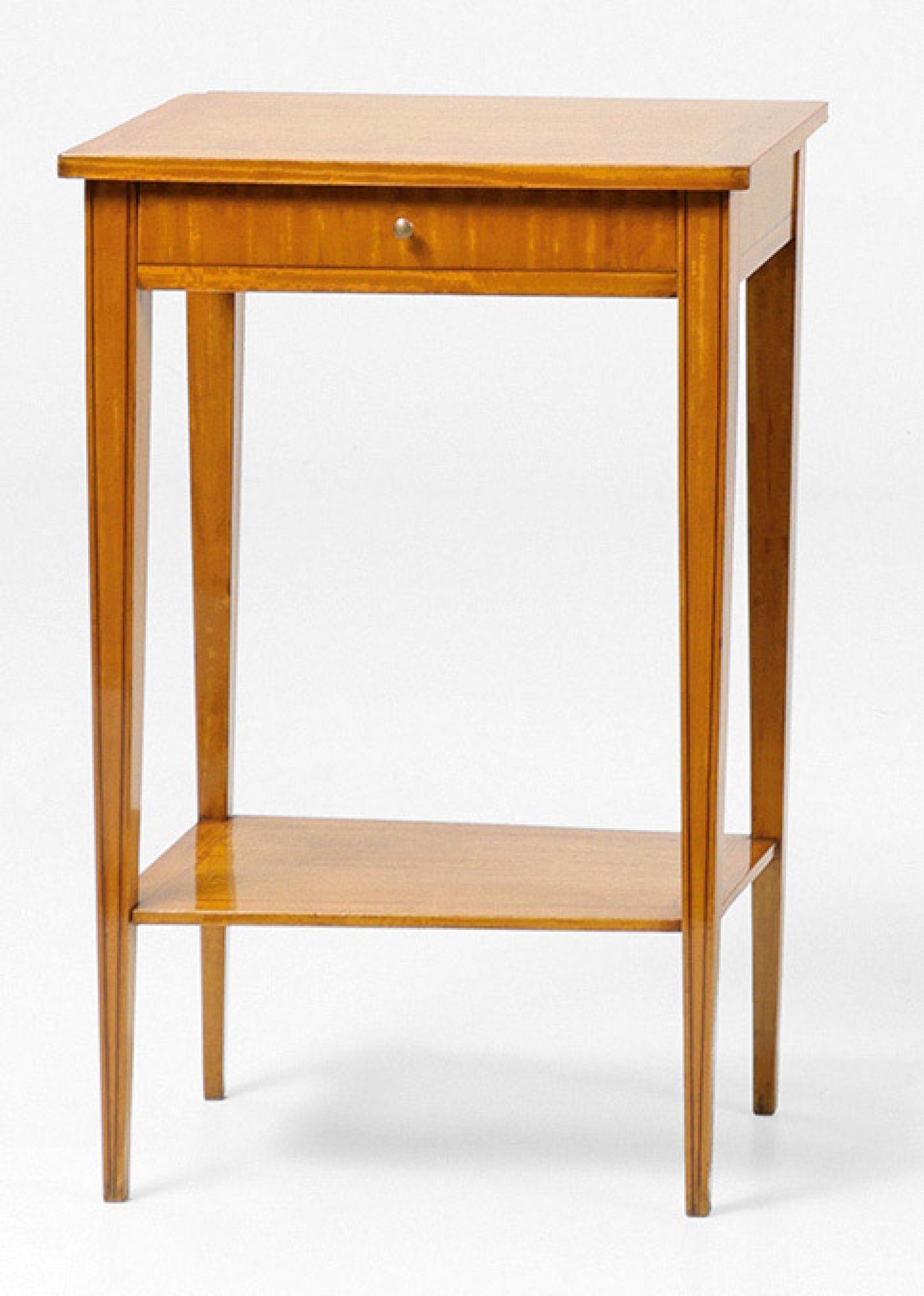 Louis XVI-Beistelltisch Satinholz, furniert. Gerader, einschübiger Zargenkasten auf hohen, konischen Vierkantbeinen, unterhalb durch Ablagefach verbunden. Gering überstehende, rechteckige Deckplatte. Schmale Bandeinlagen. H. 76 cm. 50 cm x 33 cm.