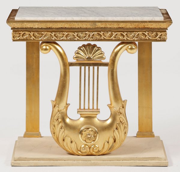 Gustavianischer Konsoltisch Holz, geschnitzt, elfenbeinfarben und in Marmoroptik gefasst bzw. teilw. vergoldet. Großes Lyramotiv und flache Pilaster als Träger für schmale Zarge mit appliziertem Fries aus Weinlaub. Profilgerahmte Deckplatte aus weißem, hellgrau gemasertem Marmor. Unterhalb flache Sockelplatte. Rest.; H, 66 cm. 74 cm x 41 cm.