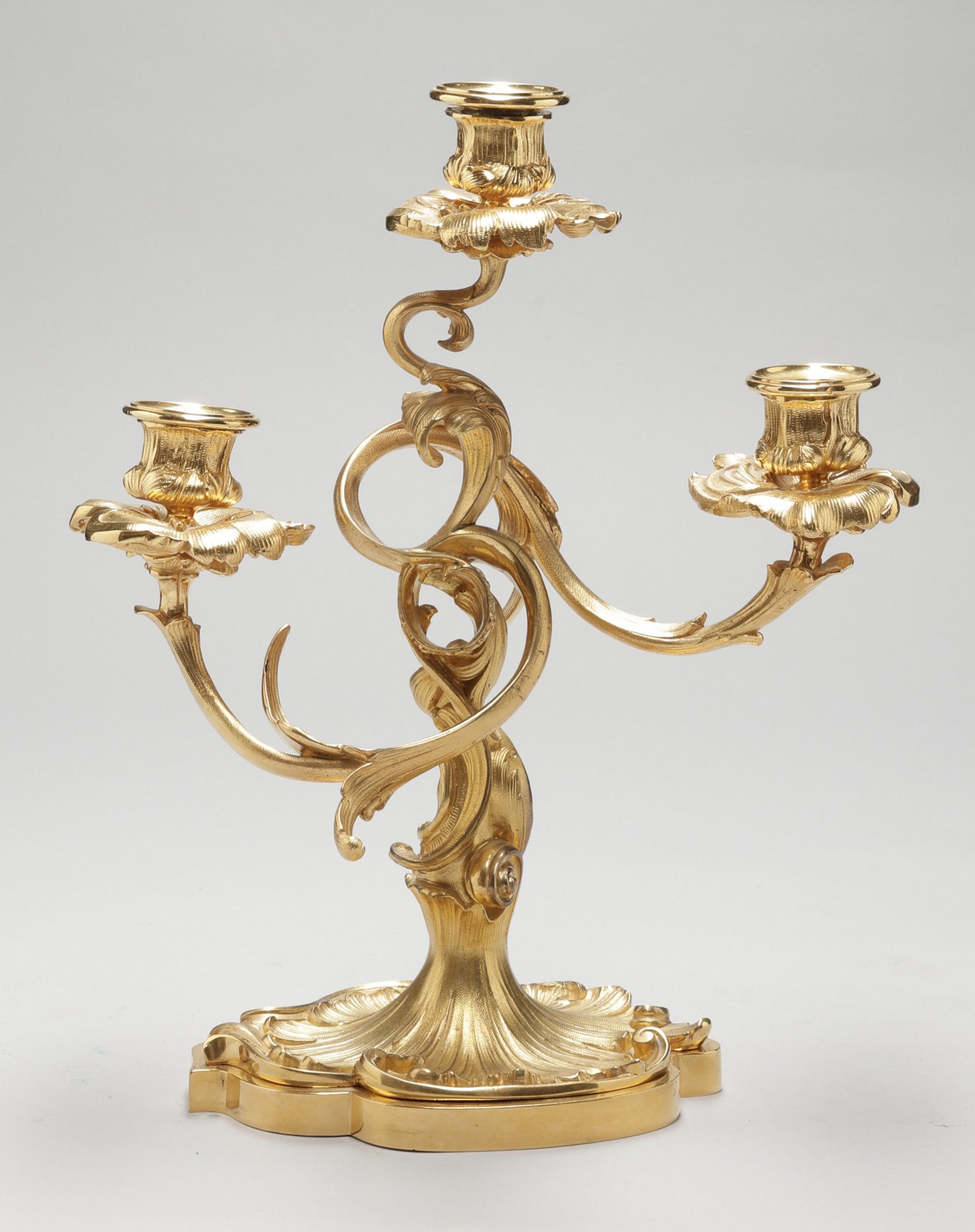 Elegante Girandole im Louis XV-Stil 3-flg.; Bronze, vergoldet. Über passig geschweifter Basis mit erhaben reliefiertem Muschelwerk stark geschwungener Schaft aus gegeneinander gestellten Rocaillen als Träger für stark geschwungene Leuchterarme mit vasenförmigen Tüllen. H. 37 cm.