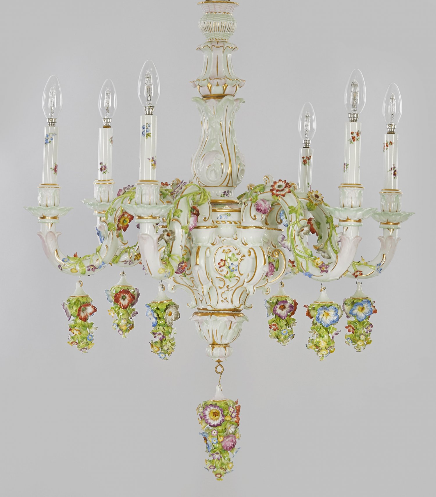 Porzellan-Deckenlüster mit prächtigem Blumendekor 6-flg.; Balusterförmiger, mehrfach gegliederter Korpus, unterhalb mit vorwölbender, von gegenläufigen C-Bögen umzogener Wandung. Sechs abnehmbare, geschweifte und mit plastischen Blütenranken belegte Leuchterarme, in vasenförmiger Tülle und zylinderförmigen Abschlüssen über blattartiger Traufschale endend. Umlaufend reliefplastischer, in Seegrün und Zartrosa staffierter Dekor aus Blatt- und Rocaillenwerk sowie teilw. in Kartuschen gerahmte Blütenzweige-, -gebinde und Streublumen. Unterhalb hängende, tropfenförmige Blumenbuketts, arrangiert aus feinmodellierten, sommerlichen Blüten. Polychrome Malerei mit reicher Goldstaffage. Entw. Ernst August Leuteritz. Elektrifiziert. Schaft-H. ca.60 cm. D. ca. 67 cm.