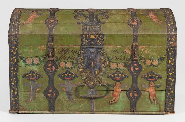 Große Barock-Runddeckeltruhe Eichenholz, später farbig gefasst. Sich konisch verbreiternder Korpus mit hochgewölbtem Rundeckel, von durchbrochen gearbeiteten Eisenbeschlägen aus Blattvoluten umspannt. Große gebogte Griffe. Dekorationen aus aufgelegten Putten unter Blattkronen. Grüner Fond, schauseitig mit Rosenfestons. Dat. 1855 sowie Heinr. und Anna Ecks. Innen sog. Hohe Kante. H. 81 cm. 132 cm x 65 cm.