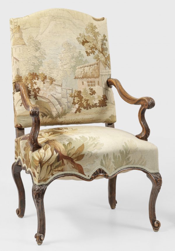 A French partly carved walnut Baroque armchair.