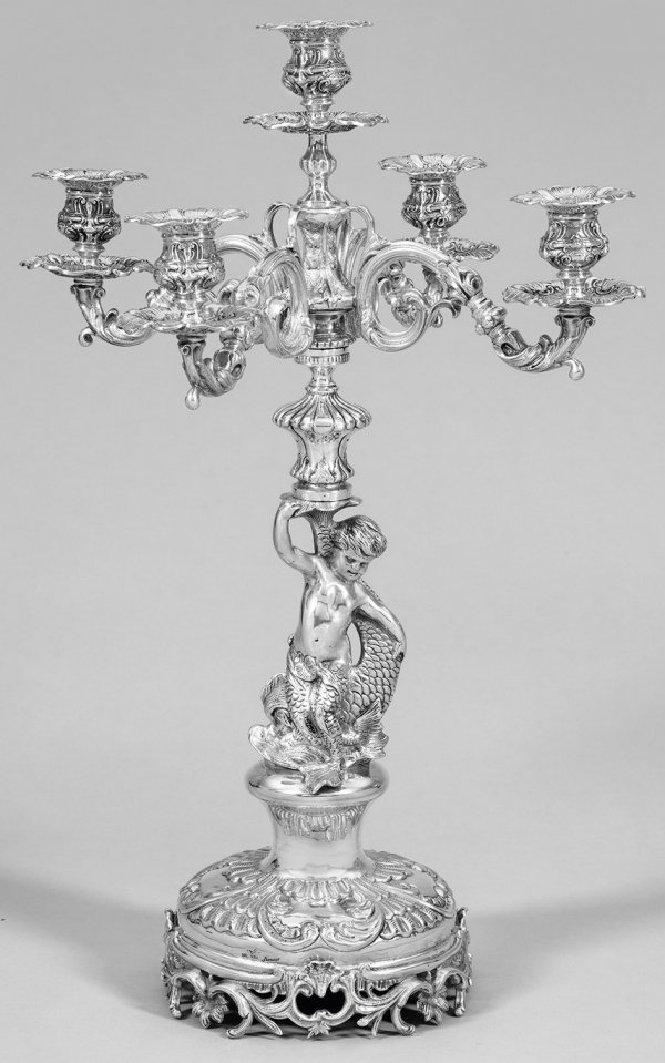 Große Prunkgirandole Silber. 5-flg.; Von Voluten getragener Stand mit Rocaillen-Reliefdekor. Vollplastischer Schaft in Gestalt eines Tritonknabens auf einem Delfin. Oberhalb in einer vasenförmigen Tülle endender Balusterschaft, davon ausgehend vier volutengeschweifte Leuchterarme. Reicher Reliefdekor im Rokokostil. Gest. 925. Herstellerzeichen. Gew. ca. 3340 g. H. 55 cm.