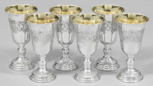 Sechs Weinbecher Silber. Ausschwingende Kuppa über trompetenförmig hochgezogenem Stand. Umlaufend reliefplastisch aufgelegter Weinlaubdekor mit üppigen Weinreben. Innen vergoldet. Gest. 925. Herstellerzeichen. Gew. zus. ca. 492 g. H. 13 5 cm.