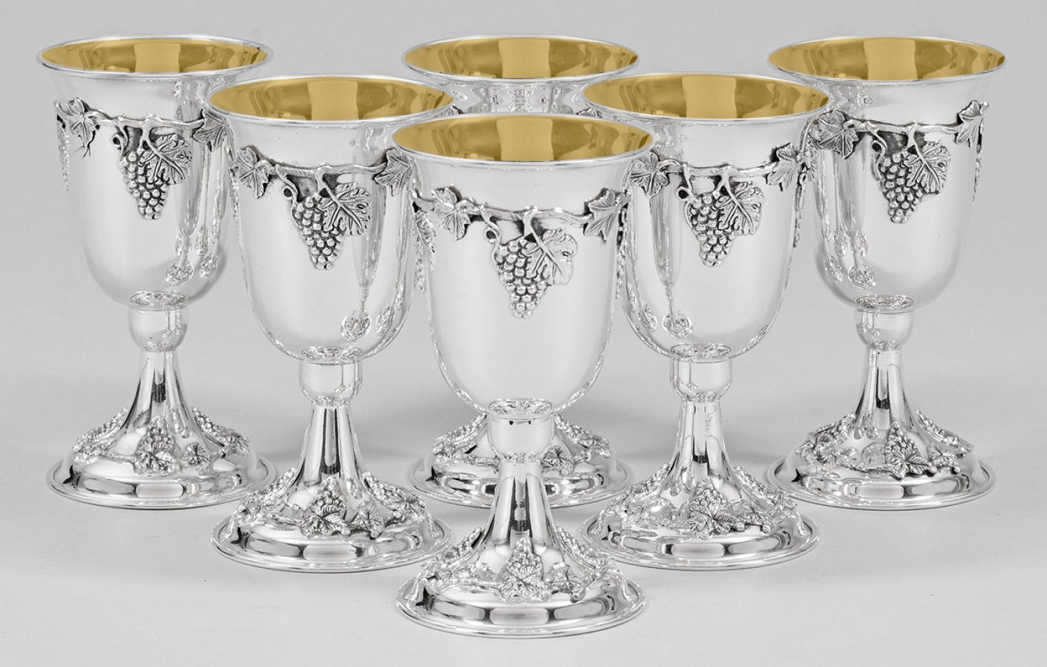 Sechs Weinpokale Ausschwingende Kuppa über trompetenförmig hochgezogenem Stand. Umlaufend reliefplastisch aufgelegter Weinlaubdekor. Innen vergoldet. Gest. 925. Gew. zus. ca. 1240 g. H. 15 cm.
