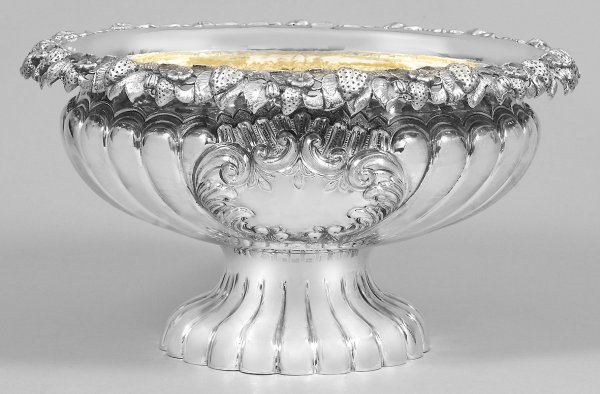 Prunk-Champagnerkühler Silber. Gedrückt bauchiger godronierter Korpus mit weit ausschwingendem von reliefplastischen Erdbeeren umzogenem Rand. Auf der Wandung zwei von Voluten gerahmte Kartuschen. Innen vergoldet. Gest. 925. Gew. ca. 2480 g. H. 22 5 cm. D. 41 cm.