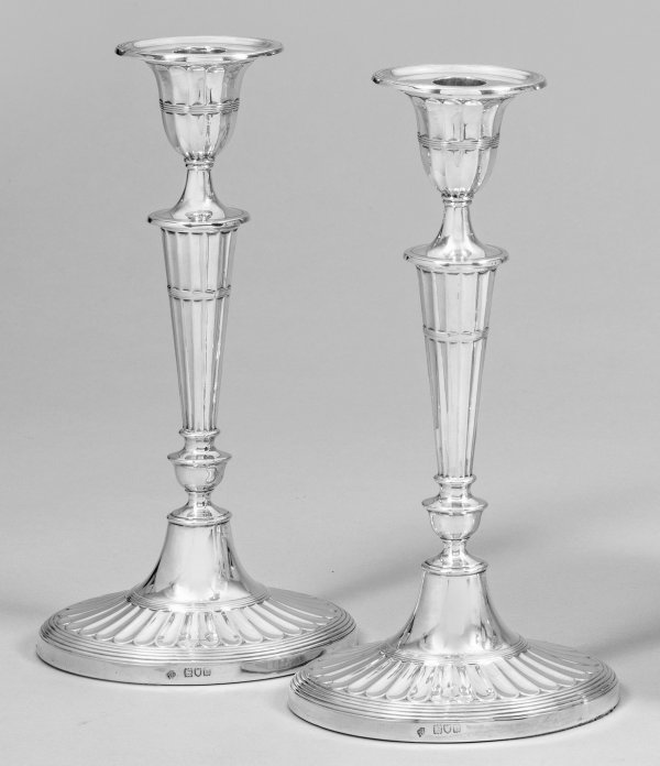 Paar Tafelleuchter Silber. Ovaler randprofilierter auf der Oberseite blütenartig reliefierter Stand beschwert. Vasenförmige Tülle mit herausnehmbarer ovaler Traufschale über kanneliertem konischem Schaft. Gest. Beschaumarken Herstellerzeichen. Gew. ca. 2100 g. H. 28 5 cm.