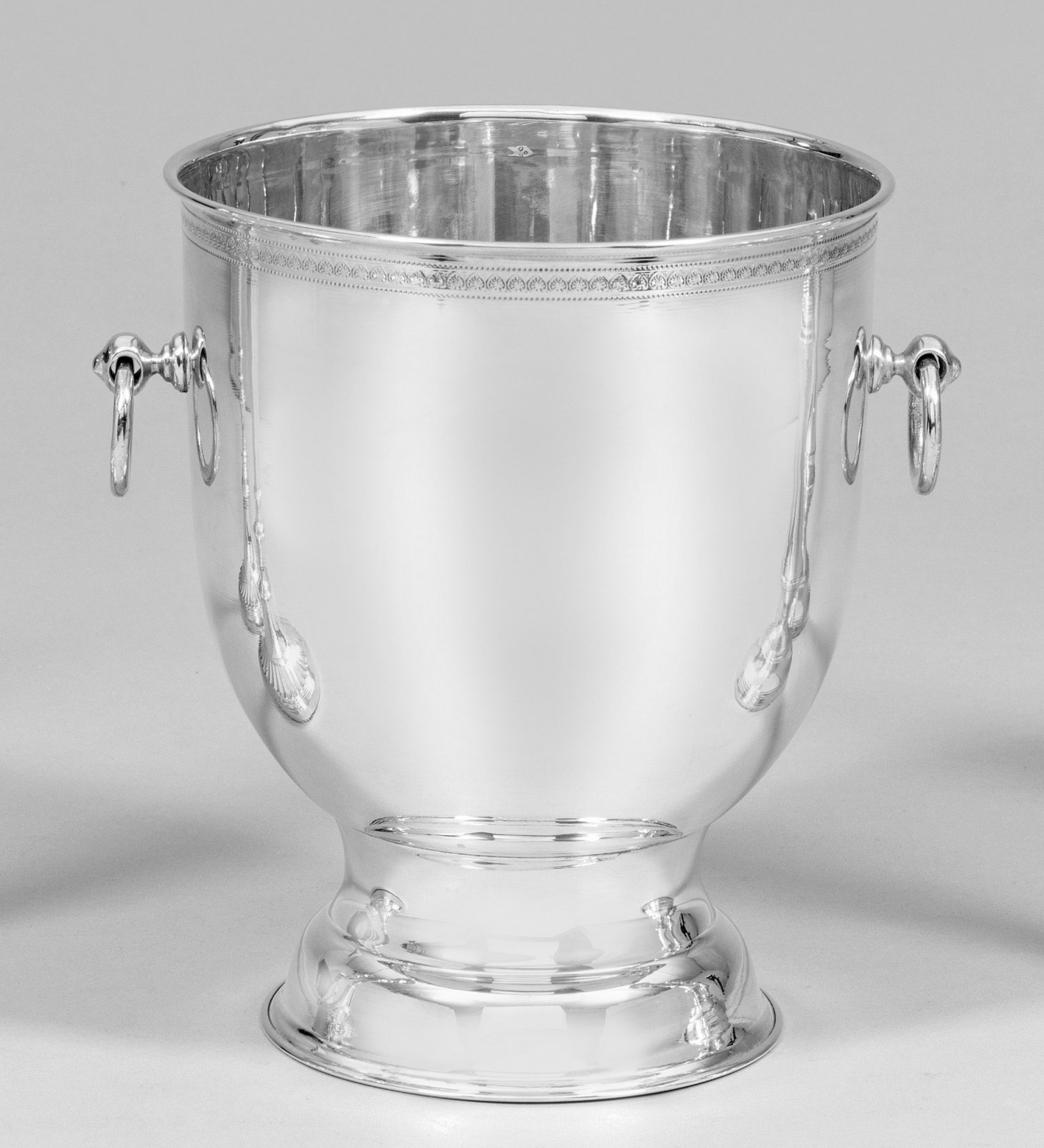 Flaschenkühler Silber. Über gewölbtem Stand hoher gerader Korpus unterhalb des profilierten Randes gravierter Blattfries. Bewegliche Ringgriffe. Gest. 925. Gew. ca. 850 g. H. 22 5 cm.