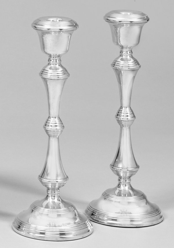 Paar große Tafelleuchter Silber. Hoher Balusterschaft über trompetenförmigem Stand beschwert. Korpus umlaufend mit Profillinien gegliedert. Gest. Beschaumarken Herstellerzeichen. Minim. Gebrauchsspuren. Gew. zus. ca. 1667 g. H. 30 5 cm.