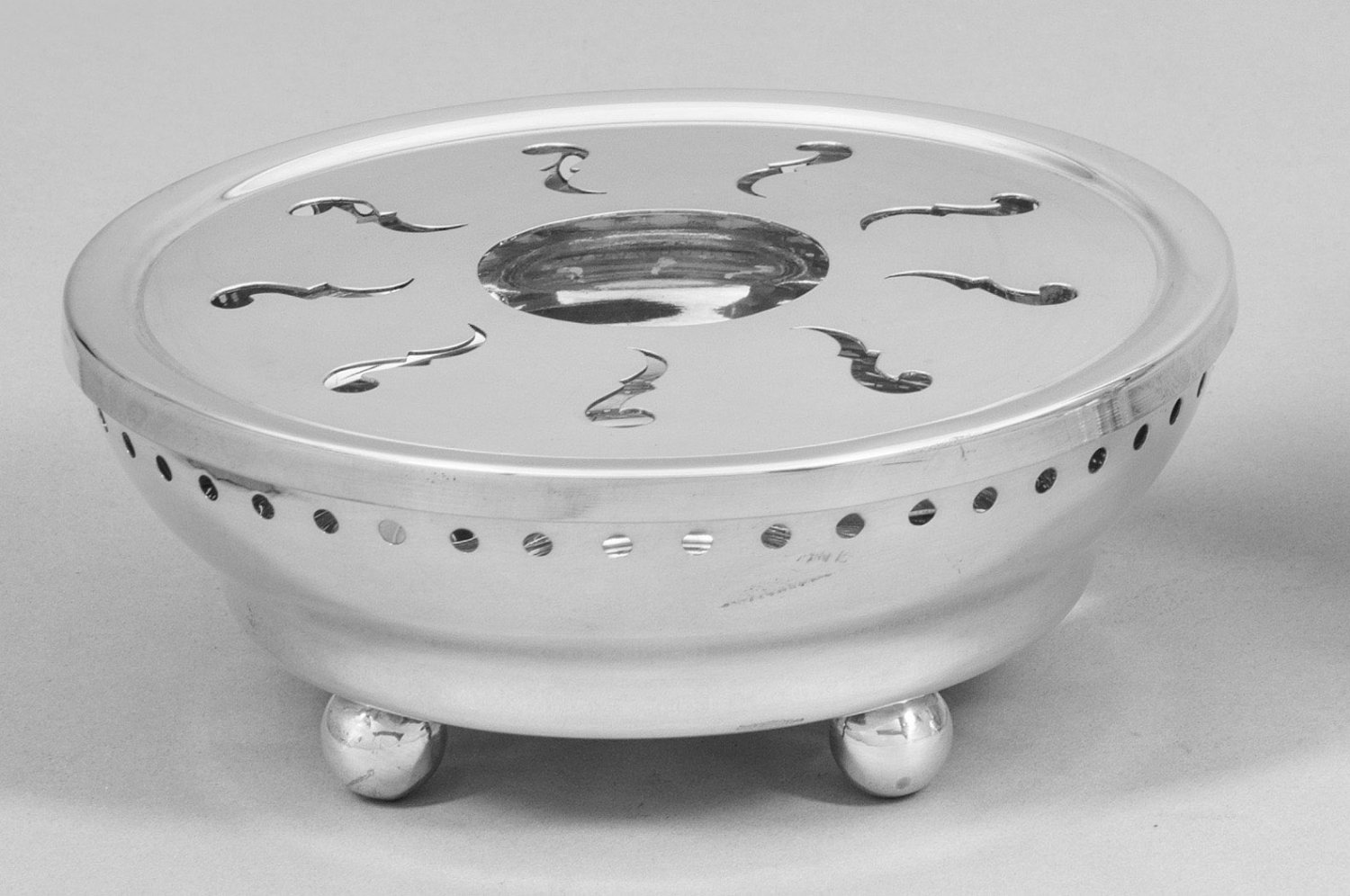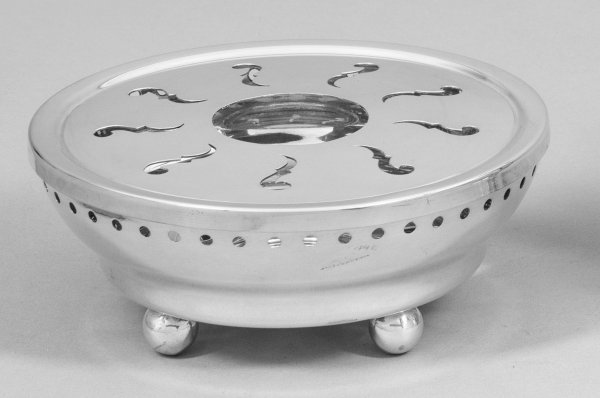 Stövchen Silber. Von Kugelfüßen getragener Korpus mit abnehmbarer ornamental durchbrochen gearbeiteter Deckplatte. Gest. 800. Gew. ca. 360 g. D. 15 cm.