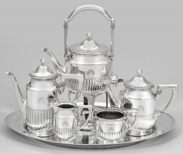 Prachtvolles Kaffee- und Teeservice Silber. 6-tlg.; Kaffeekanne, Teekanne, elektrischer Wasserkocher mit Rechaud, Sahnegießer, Zuckerdose und Tablett. Gerader Korpus mit glatter Wandung. Auf der unteren Wandungshälfte umlaufend reliefplastisch godroniert. Der Rand mit Perlfries verziert. Schauseitig graviertes, bekröntes Allianzwappen u.a. der Familie von Carlshausen in Altenhaßlau. Gest. 800, Herstellerzeichen. Gew. zus. ca. 3660 g.