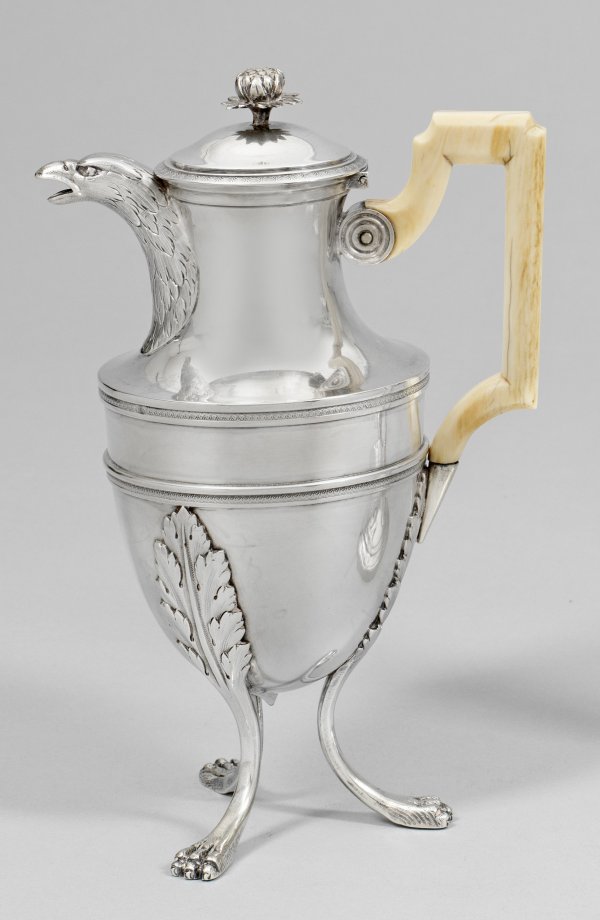 Napoleon III-Kaffeekanne Silber. Von drei gebogten Klauenfüßen mit Akanthusblattansatz getragener ovoider Korpus. Über der Schulter ein schlanker Hals mit hoch angesetztem Ausguss in Gestalt eines Adlerkopfes mit reliefplastisch gearbeitetem Gefieder. Schulter und Deckelrand von Profillinien gegliedert und mit ornamentalem Blattfries verziert. Gewölbter Scharnierdeckel mit bekrönender vollplastischer Blüte. Kantig hochgezogener Henkel aus Bein. Gest. Beschauzeichen undeutl. Meisterzeichen. Gew. ca. 726 g. H. 25 cm.