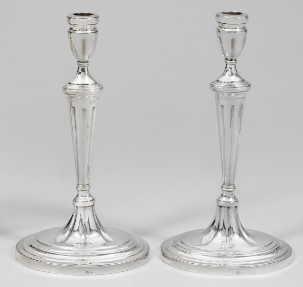 Paar große Tafelleuchter Silber. Über ovalem, getreppt aufsteigendem Stand sich konisch erweiternder Schaft. Abgesetzte Schulter übergehend in vasenförmige Tülle. Korpus mit breiten, kannelierten Zügen verziert. Minim. best.; Gest. 13 Lot, ungarische Importmarke ab 1966-1999. Gew. zus. ca. 603 g. H. 27 cm.