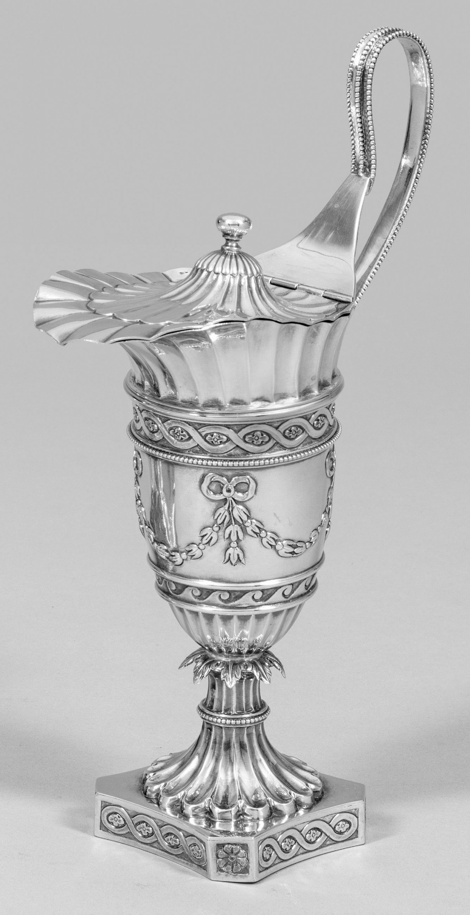 Helmkanne im Louis XVI-Stil Silber. Achtkantiger Sockel übergehend in blütenförmigen Fuß und kurzen kannelierten Schaft. Sich konisch erweiternder von mehreren Profilringen gegliederter Korpus. Auf der Wandung umlaufend reliefplastische Flechtbänder mit Wellen- und Blütendekor sowie Blätterfestons. Breiter Ausguss und gering gewölbter Scharnierdeckel verziert mit passig geschweiften Zügen. Hoch aufschwingender Bandhenkel mit Perlfriesdekor. Gest. 916 Beschaumarke undeutl. Herstellerzeichen. Gew. ca. 505 g. H. 26 cm.