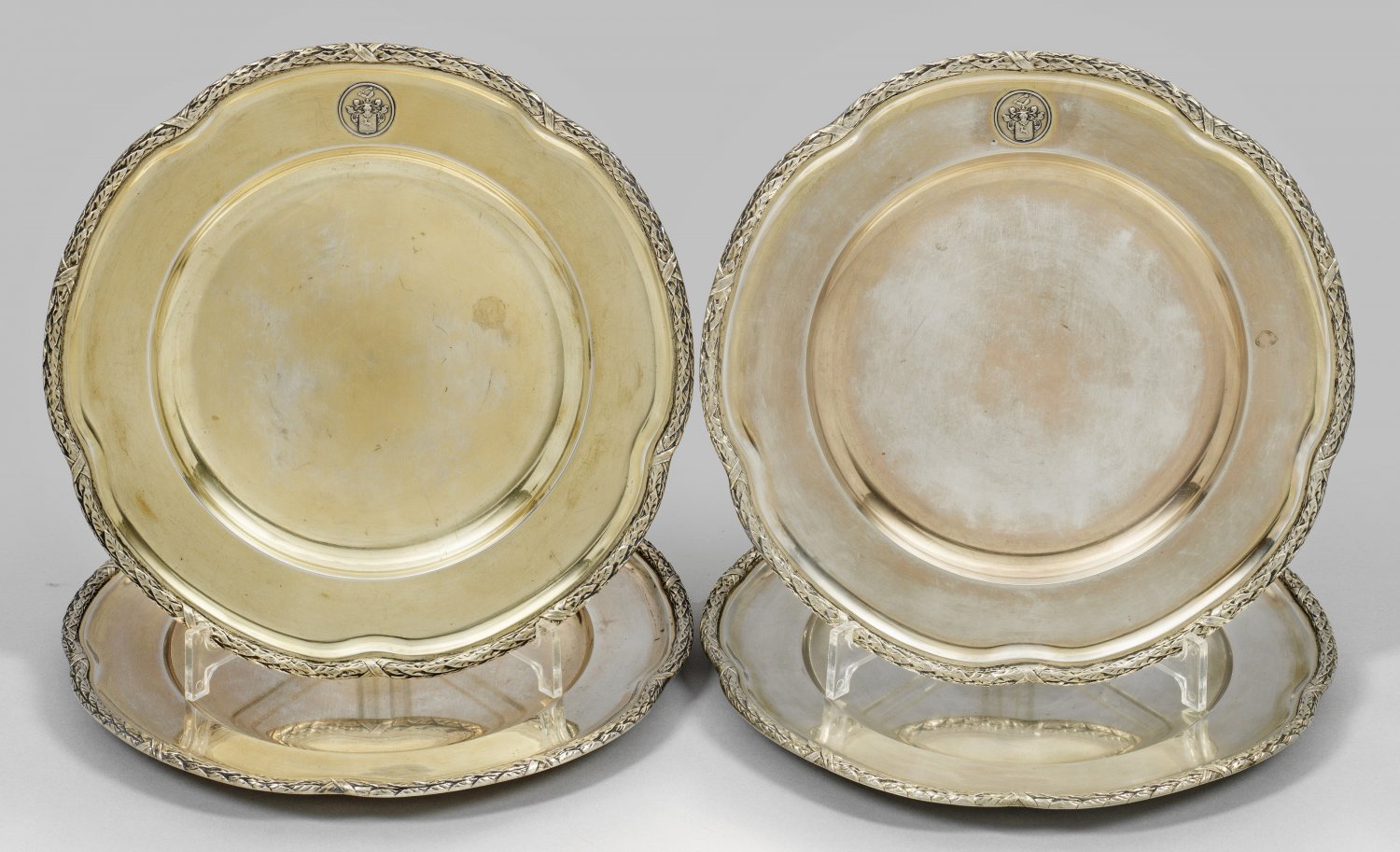 Vier große Teller aus Adelsbesitz Silber. Gering vertiefter glatter Spiegel übergehend in breite leicht ansteigende Fahne. Blütenförmig geschweifter Rand umzogen von reliefplastischem Lorbeerblattfries und Kreuzbanddekor. Auf der Fahne eingelassenes rundes Medaillon mit dem Wappen der Familie von Hirsch auf Gereuth. Altersbedingte Gebrauchsspuren. Gest. 800 Herstellerzeichen. Gew. ca. 2140 g. D. 26 cm.