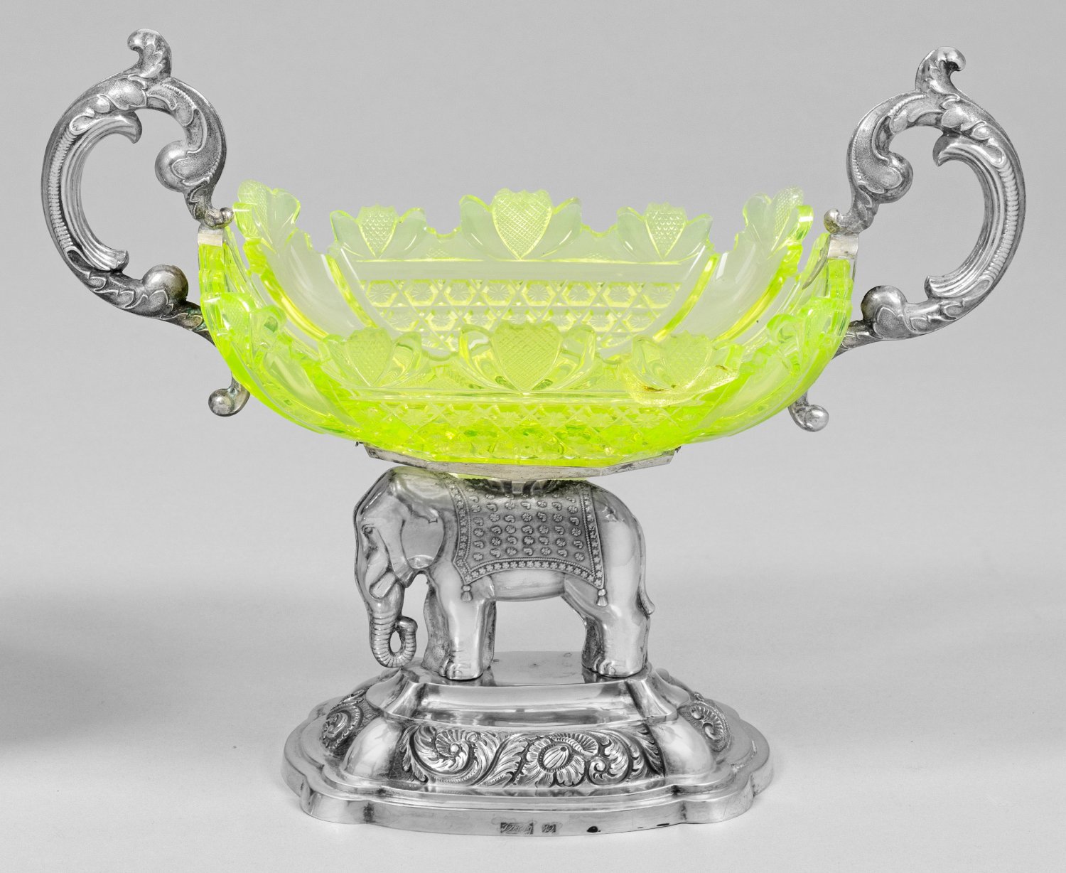 Silberner Tafelaufsatz mit Uranglasschale Silber, Glas. Passig geschweifter, gewölbter Fuß mit floralem Fries. Von einem plastischen Elefanten getragener Korpus aus grünem Uranglas. Volutenhenkel. Glas geringf. rest.; Gest. 12, Meister wohl Wilhelm Baring in Göttingen (wird Meister 1840). Gew. zus. ca. 638 g. H. 20 cm.