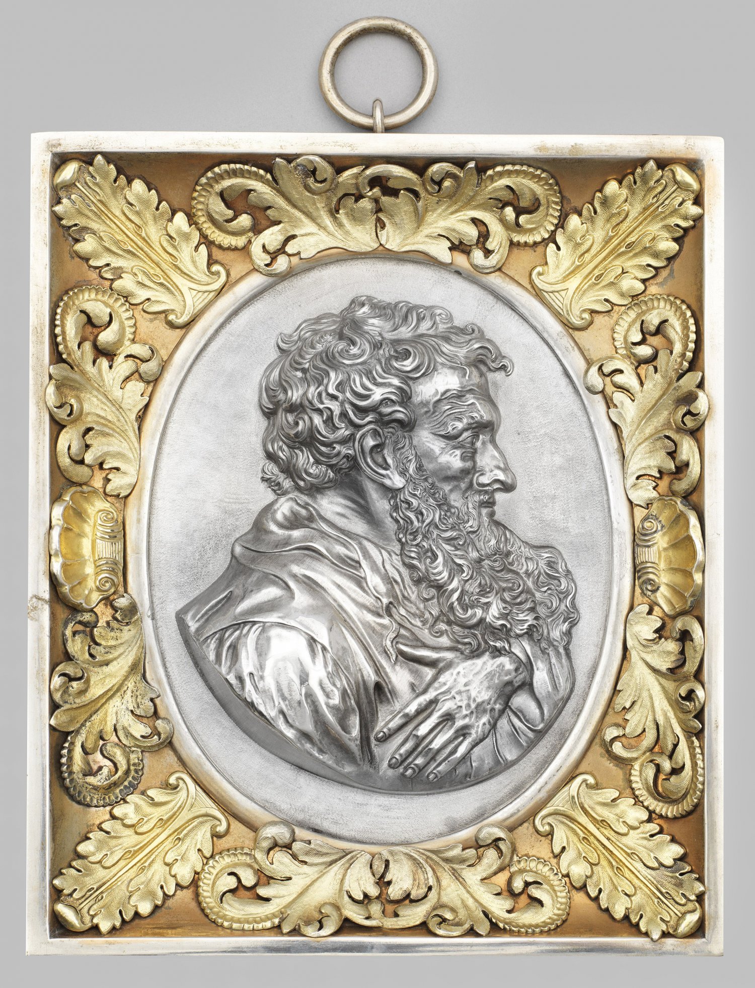 Silber teilvergoldet. Im Oval die hochreliefplastische Büste des Apostels Paulus mit langem Bart die linke Hand an die rechte Brust gelegt. Die Darstellung des Apostels Paulus geht zurück auf den Entwurf eines Porträtmedaillons von Leonhard Posch (1750-1831). Gerahmt von einem rechteckigen glatten Rahmen mit reliefplastischen Ornament-Applikationen im Muschel- und Blattdekor. Auf der Rahmenaußenseite das Monogramm von Ernst August I. von Hannover unter Königskrone. Am oberen Rand Öse zur Aufhängung. Sign. Meister Georg Drewes (wird Meister 1834). Gew. ca. 543 g. H. 20 5 cm.