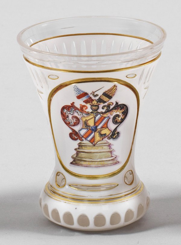 Wappenbecher Farbloses Glas mit Zinnemailüberfang. Ornamentaler goldkonturierter Schliffdekor schauseitig ein Ovalmdaillon mit Wappen auf Podest in polychromer Emailmalerei und Gold Inschrift ''V: AUBICH MDCCCXI''. H. 12 cm.