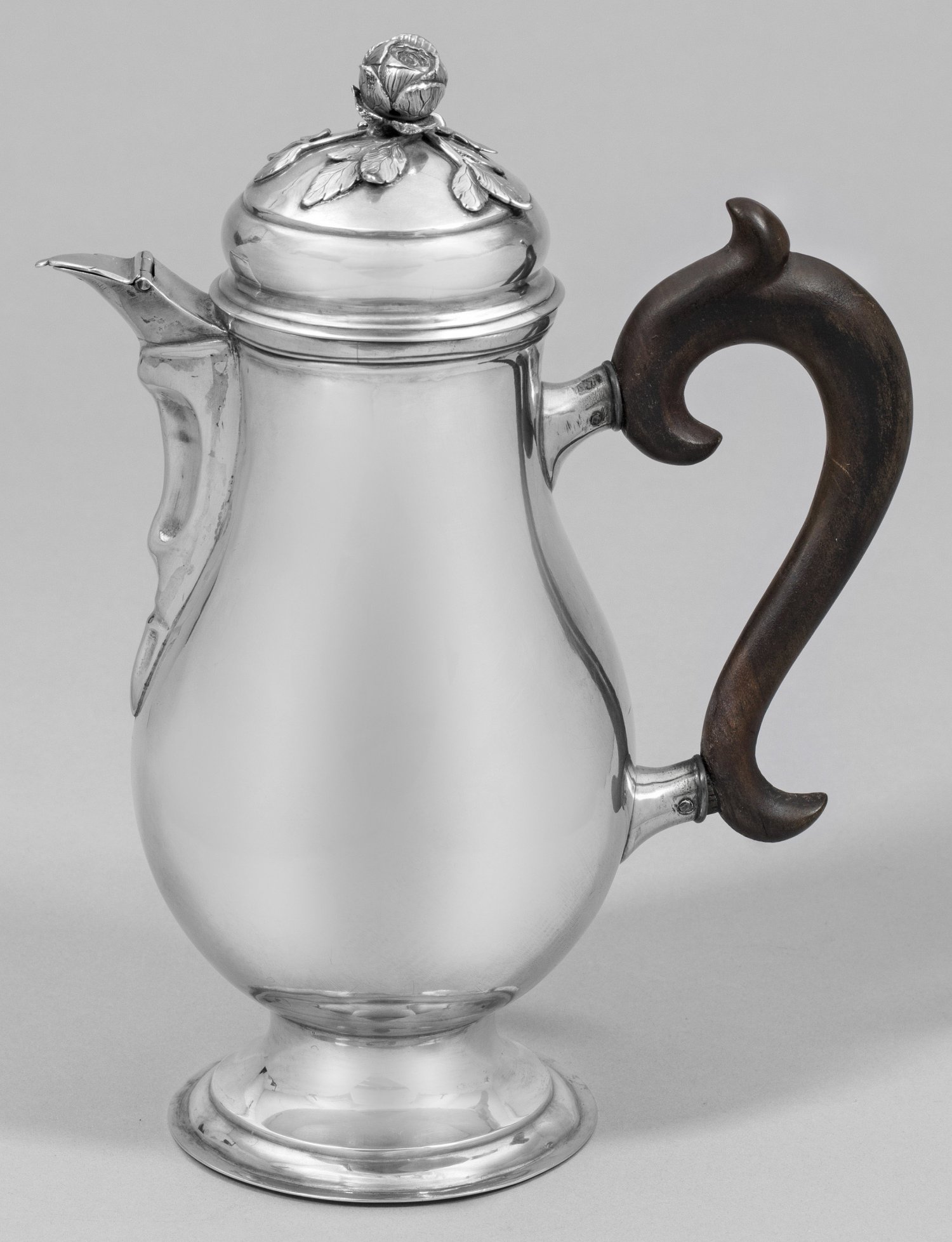 Seltene Barock-Kaffeekanne Silber. Über leicht getrepptem trompetenartigem Stand ein birnförmiger glatter Korpus. Hoch gewölbter Scharnierdeckel mit Balusterknauf in Form einer vollplastischen Rosenblüte umgeben von Blättern. Als Daumenrast seitlich eine reliefplastische Rocaille. Kurzer Konsolausguss mit Scharnierdeckel. Volutenhenkel aus Holz. Gest. Stadtmarke Meister Friedrich Heinrich Pfeiffer (wird Meister um 1774). Gew. ca. 573 g. H. 25 cm.