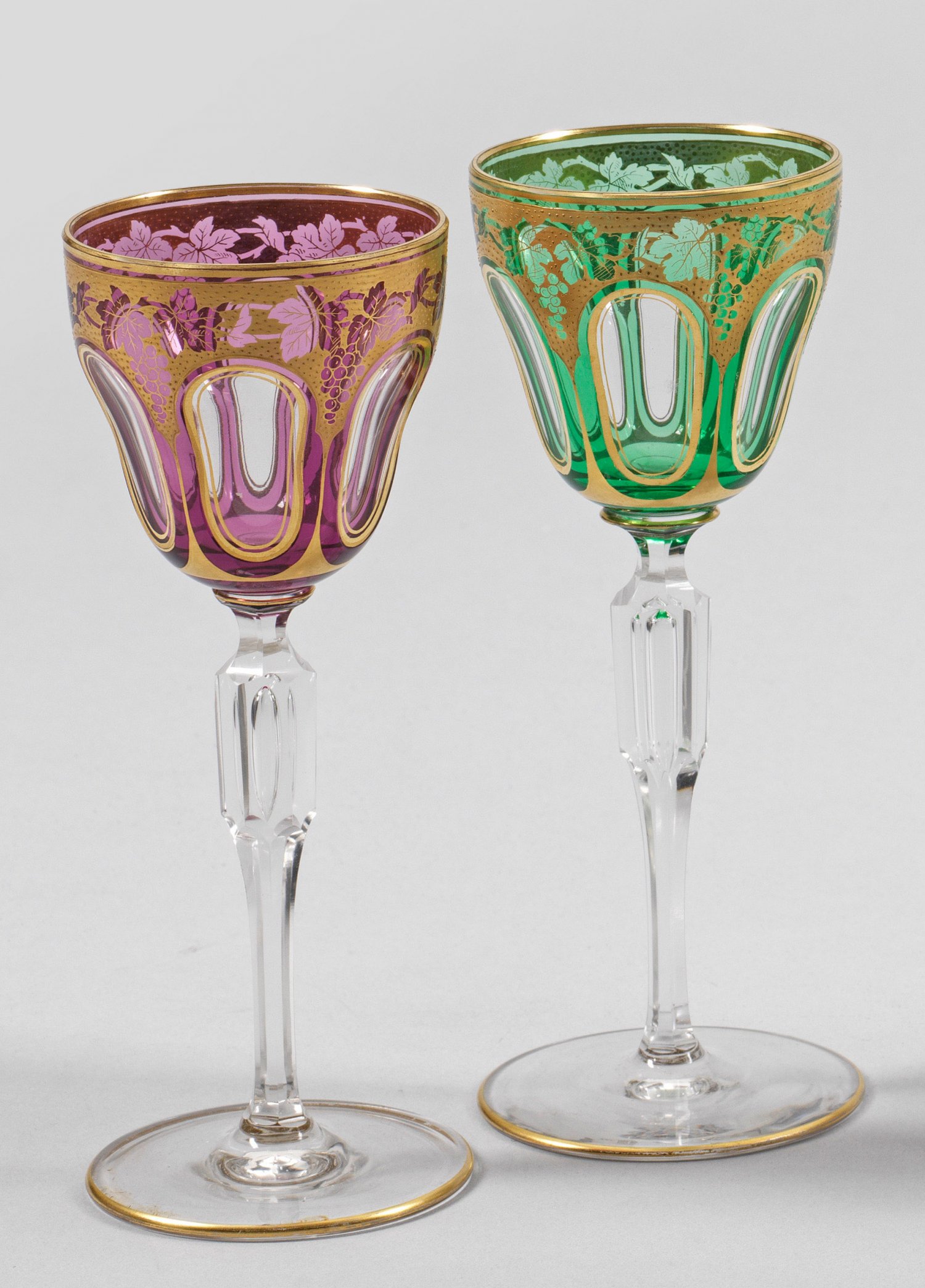 Paar Weingläser Farbloses Glas, die glockenförmige Kuppa violett bzw. hellgrün lasiert. Facettierter, schlanker Balusterschaft mit eingestochener Luftblase. Die Kuppa dekoriert mit goldkonturierten, ausgeschliffenen Zungen sowie Weinranken und -trauben in feiner Goldmalerei. Form-Nr. 989, Entw. S. Hartel, um 1905; Dekor-Nr. 2080, Entw. A. Pfohl, um 1919. H. 19,7 cm.