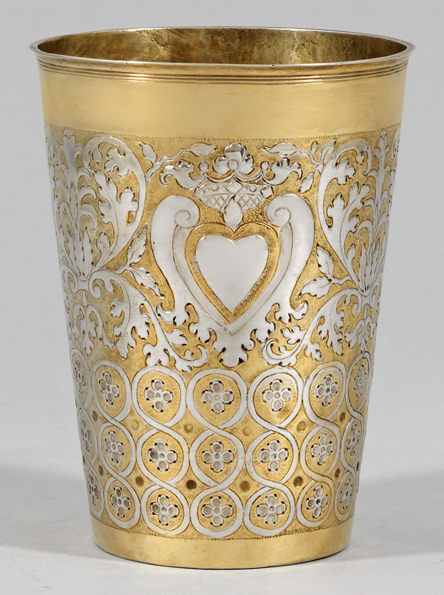 Großer Ohlauer Barock-Becher Silber, teilvergoldet. Konisch mit glattem Rand. Untere Wandungshälfte umzogen von dreireihig angeordneten, in sich geschlungenen Kreisornamenten, darin stilisierte Blüten. Obere Wandungshälfte fein graviert in Form von Blattranken, im Wechsel mit reliefplastisch gearbeiteten, bekrönten Herzen. Auf dem Boden gravierter Besitzername "Rudolph Kätzler", dat. 1710. Gest., Tremolierstrich, Stadtmarke, Meister Gottfried Kittel (wird Meister 1697). Gew. ca. 155 g. H. 14,7 cm.