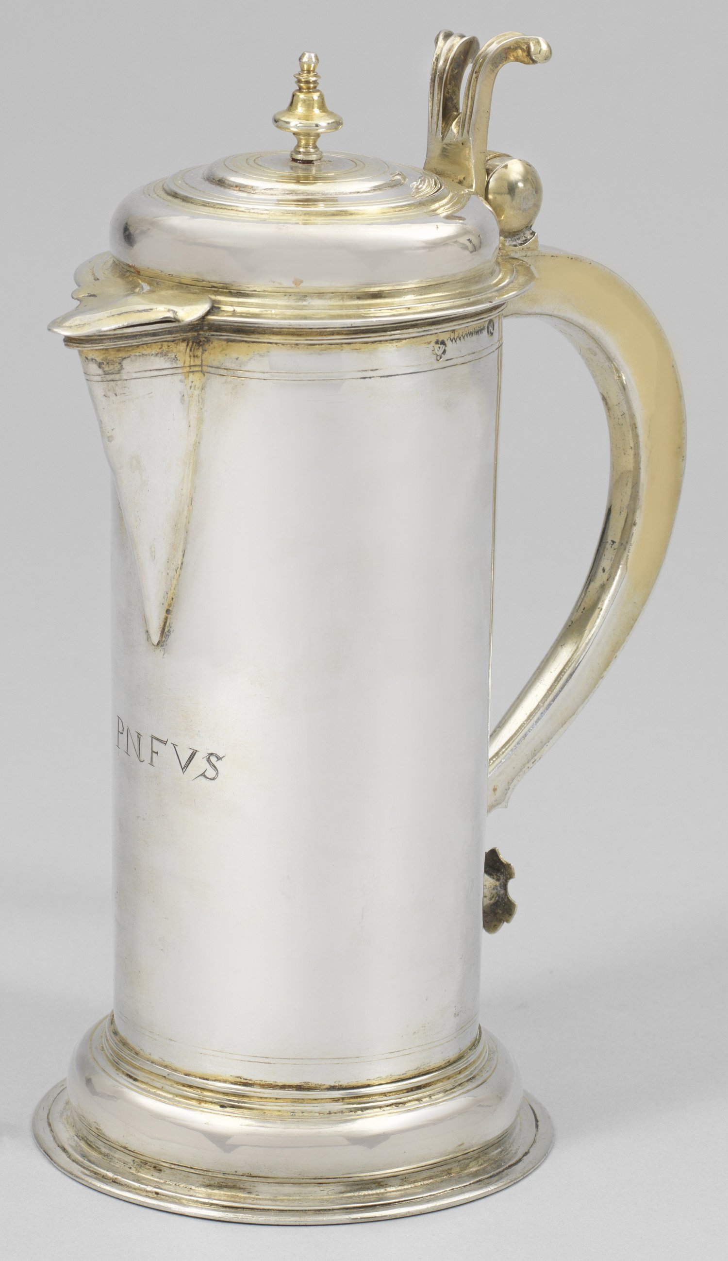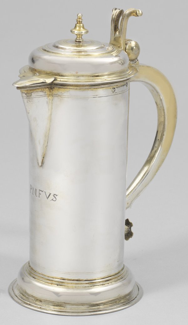 Abendmahlskanne Silber, teilvergoldet. Profilierter, aufgewölbter Stand, übergehend in zylindrischen Korpus mit mittig angesetztem Ausguss. Gering gewölbter, scharnierter Deckel mit kleinem Balusterknauf und Ausgussabdeckung. Konischer Volutenhenkel, in geteilter, volutenförmiger Daumenrast endend. Auf der glatten Wandung graviertes Monogramm "PNFVS". Gest., Tremolierstrich, Stadtmarke, Meister Conrad Weiß (wird Meister 1666). Gew. ca. 554 g. H. 22,5 cm,