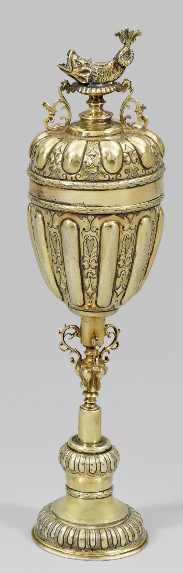 Musealer Renaissance-Deckelpokal Voll vergoldet. Runder Hohlfuß gerahmt von breiten Zungenornamenten. Hoher, zylindrischer Schaft, mittig dekorativ gearbeitet in Form einer Vase mit drei Voluten als Griffe. Becherförmige Kuppa umlaufend gegliedert durch längliche Buckel, im Wechsel mit fein getriebenen und ziselierten Ornamenten. Entsprechend gearbeiteter Deckel bekrönt von einem vollplastisch gestalteten Fisch über volutengestützter Konsole. Deckelrand minim. besch.; Gest., Tremolierstrich, Stadtmarke, Meister Hans I Clauß (wird Meister 1627). Gew. ca. 460 g. H. 37,5 cm.